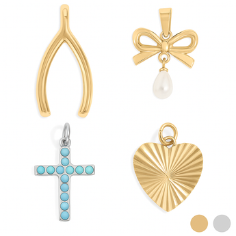 Our charms are crafted from 316L surgical-grade stainless steel and finished with a luxurious 18K Gold PVD coating for a polished, non-tarnish shine that lasts. Each piece—from the bow with a freshwater pearl to the sunburst heart, wishbone, and turquoise cross—features exceptional durability, maintaining its color and brilliance through everyday wear.
